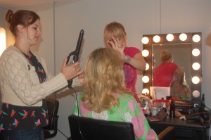 But I wasn’t quite as pleased with myself when we walked into the granite-walled lobby, and I realized I had not a clue what floor we needed to head to. A quick text message, phone call and email later, we were on the elevator with a sweet summer intern. She took us to the green room where the kids plopped on the couches, armed with an iPad and an iPhone to keep them entertained. I was wisked away to Hair and Makeup.