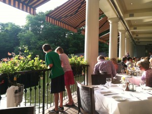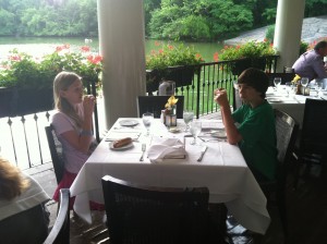 We ended up in Central Park, passing kids still in their school uniforms, outdoor exercise classes and lots and lots of little dogs on tiny leashes. We ended up at The Boathouse, all of us super hungry, but way underdressed for dinner. As evidence from the picture below, we threw caution to the wind and somehow the hostess was nice enough to seat us at a gorgeous table right next to the water. The kids wanted to order the $48 steaks but settled for the $12 cheeseburgers off the kid’s menu instead!